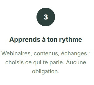 Un quiz se fait en 5 minutes. Un webinaire dure 45 minutes. Tu avances à ton rythme, quand tu veux. Pas de programme imposé, pas de calendrier à respecter. Même 5 minutes par semaine peuvent faire la différence quand on part de zéro.