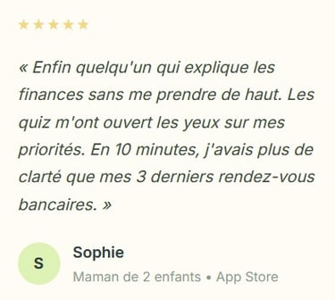 En 5 minutes, tu obtiens un diagnostic précis de ta situation. Mindset financier, gestion du budget, niveau de connaissances : chaque quiz te donne des réponses concrètes et un bilan détaillé avec des pistes d'action.