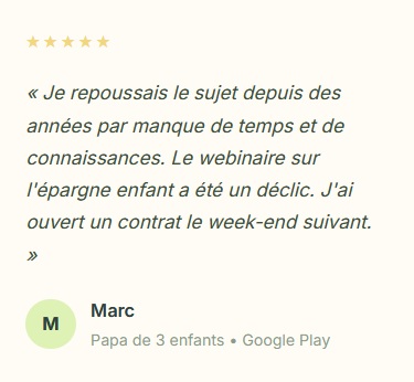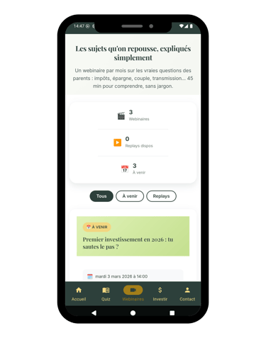 45 minutes pour maîtriser un sujet clé : impôts, épargne enfant, investissement, transmission… Animés par un conseiller en gestion de patrimoine, pas un vendeur de rêves. Tu repars avec des actions concrètes à mettre en place dès le lendemain.