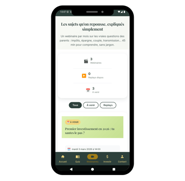 Impôts, épargne, transmission, couple et argent… Chaque mois, 1 webinaires en direct pour comprendre et agir. Animés par un vrai conseiller en patrimoine, pas un influenceur.