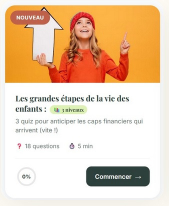 Étapes de vie des enfants, budget familial sans galère, base en investissement… Choisis ton quiz et découvre ton bilan en 5 minutes.